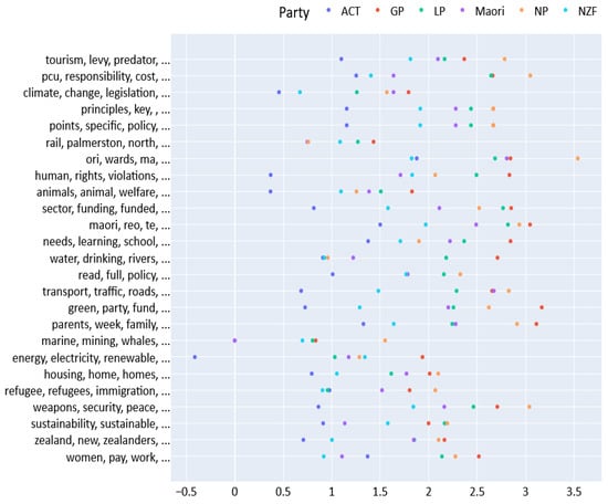 Since the topics are created from the Green Party’s manifesto, it is reasonable that the Green Party (the red dot) tends to have a high positive score on most of these issues. The Green Party is an environmentalist party and it tends to favor redistribution policies, thus, it is also reasonable that it has the highest positive polarity on issues such as “energy, renewable”, “water, drinking” and “needs, learning, schools”.