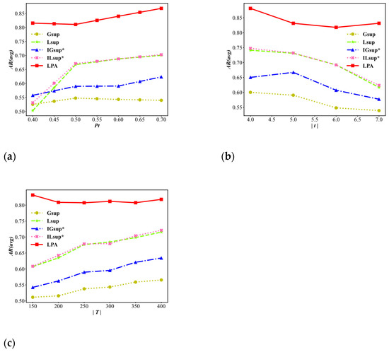 As shown in Figure 8a, with the increase of , the AR(avg) values of all algorithms show an upwards trend, and the AR(avg) values of the LPA algorithm are always significantly higher than those of the others. In Figure 8b with the increase of , the AR(avg) values of the four algorithms gradually decrease, but the AR(avg) values of the LPA algorithm take 6 as the critical point and show a trend of first decreasing and then increasing. Moreover, the AR(avg) value of the LPA algorithm is always higher than that of the other algorithms. Figure 8c shows that as increases, the AR(avg) values of the LPA algorithm fluctuate within the range of approximately 0.80 and are always higher than those of the other four algorithms. The reason for this phenomenon is that the LPA algorithm considers three techniques as candidate techniques, and the application of the LP function reduces the frequency of the suppression and reduces the information loss of anonymity processing.