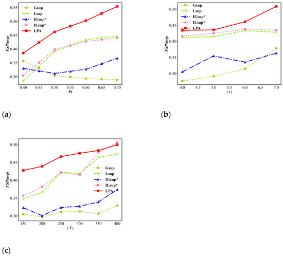 As shown in Figure 9a, for LPA, , and , the general trend is that the FSP(avg) values increase as increases, while the trends of and have no obvious upwards motion. Furthermore, the FSP(avg) values of the LPA algorithm are significantly better than those of the other algorithms because the LP function of the LPA algorithm gradually processes the problematic nodes and merges the nodes, which improves the FSP(avg). In Figure 9b, the FSP(avg) values gradually increase with an increasing , and the FSP(avg) value of the LPA algorithm is always higher than that of the other algorithms. The reason for this result is that the longer the average trajectory length is, the higher the number of problems. Similar to the data in the previous two experimental results, Figure 9c shows that as increases, the FSP(avg) values show an overall upwards trend, and the values of LPA are overall higher than those of the other algorithms. It can be concluded that the overall performance of FSP(avg) in LPA is better than that of the other algorithms.