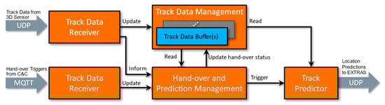 The 3D Video tracks all persons accurately in the field of view of the three-dimensional sensor independent of all other systems. Figure 3 depicts the 3D Video system software architecture. The system receives track data from the three-dimensional sensor over an UDP socket and stores track data object-specifically (i.e., per a person) for two seconds starting from the current timepoint backwards. The management procedure keeps computational memory constraints in check by removing obsolete track samples and expired tracks periodically.