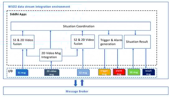The Data fusion core apps are detailed in Figure 5. To meet the real time requirement, these apps run in different threads, each with a specific objective, and synchronize on shared data (i.e., common data streams shared by means of @source and @sink identifiers of Siddhi []). The 2D Video Msg Integration App listens to 2D Video-dimensional messages, provide other apps with relevant data for fusion, and correlates messages referring to the same commuter. For each sensor, a specific app is in charge at fusion with 2D Video data, to associate the sensor result with the image of the person. All the apps share an INSTEAD identifier of the commuter that is used by the Situation Coordination App to temporally align the data in correspondence of that commuter. Triggers and alarm messages are generated according to sensor results and event sequence rules to realize the flow described in Section 3.3. Situation result messages for the smart glasses and the GUI are built as soon as all the data is available or based on maximum waiting times. These can be empirically defined and adjusted during operation (without stopping the system), as it has been done during the Big City trials.