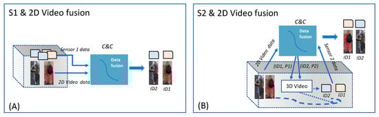C&C methods for 2D Video sensor data fusion: (A) time-based: Sensor 1 (S1) and 2D Video observe objects and persons situated at a pre-defined location; (B) Identity-based: 2D Video-C&C and 3D Video tracking handover allow one to locate (re) identified persons for Sensor 2 (S2) detection.