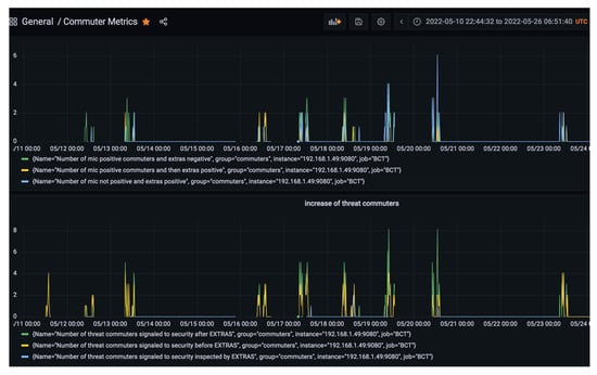 For the aims of both system performance and application-data analysis, various types of metrics have been put in place for the BCT deployed system. In particular, two groups of application-specific metrics have been implemented: “Time” and “Commuter” focused metrics. Time metrics compute the overall duration of the commuter detection in various scenarios of normal and threat cases. These have been used to compare the “virtual” duration of the trial runs with the real duration, i.e., the time employed by the system for a detection against the direct observation duration. Additionally, the time of MIC sensor–video data fusion operation has been computed to allow measuring the latency of the individual detections. This type of data at the BCT trials has been especially useful to recognize needs for component re-synchronization with the NTP server to adjust time accuracy, which is a necessary requirement for sensor–video data fusion.