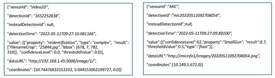 Essentially, the data fusion method creates a queue of pairs (M, V), where M is a MIC message, and V is a 2D Video message, such that the distance of detection time contained in the M and V messages is less than 2 (or 3) s, and M may be received before or after V. Then, the pair with minimum time distance is chosen. Furthermore, to accommodate eventual non-negligible latency increases for receiving the messages from the external components (including the broker or delays due to the network), a time window of 2 min is applied for the observation of the incoming messages. Critical scenarios for this type of data fusion are described in Section 5.2.