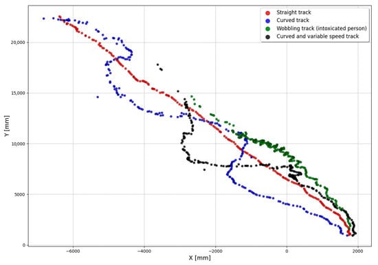 The BCT test runs consisted of tracks, which mimic real-world human walking at a metro station, including various speeds, stops, curved, and wobbling gait patterns. Figure 12 depicts real-life examples on these cases as captured during the BCT experiments by the 3D Video sensor and illustrated in X–Y plane in real-world coordinates. During the BCT test runs, the average walking speed was 0.8 m/s and 75% of the tracks had their variation within the ±0.3 m/s range.