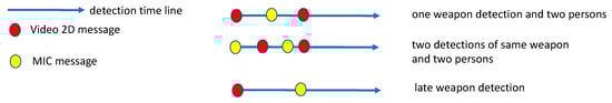 Thus, the risks of failures illustrated by the scenarios in Figure 13 should be considered when implementing such method. The first case, related to (1), shows the situation of a MIC message with detection time between those of two different persons detected by the 2D Video. In this case, the data fusion may result in an incorrect message association. The second case, related to (2), shows the situation when two detection messages of the same weapon by the sensor provide quite different (estimated) detection times so that, in case two persons are detected in between by the 2D Video, and the data fusion method may not uniquely identify the situation (e.g., two concurrent threats, carrying the same type of weapon, or just one threat detected by MIC more than once with increasing confidence level). The third case, related to (3), shows the situation when the detection times of the weapon and of the person is much different.