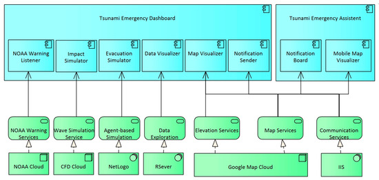 A tsunami hazard is a very low probability but potentially of a very high impact on humans and property. Yet, the growing coastal population and related rapid construction in popular coastal areas bring new vulnerabilities and challenges to the risk assessment and response orchestration procedures. In recent years, considerable effort has been devoted to tsunami source identification [1,2,3], early warning systems [4,5], tsunami modeling [6,7,8], simulations and resilience programmes [9,10,11]. Despite these efforts, incorrect forecasts of tsunami magnitude and devastation, lack of preparedness and evacuation failures reveal severe gaps in research and the corresponding practices [12,13]. The end-to-end tsunami-instigated activities are organised into so-called tsunami warning systems (TWS). A TWS is supposed to reduce disaster risk and economic damage significantly. The TWS builds on the preparedness and commitment of local authorities as critical elements for success [14]. However, as recent tsunami events show, the “last mile” component of the TWS is often rendered inadequate and ineffective at many locations worldwide [15]. The lack of detail, unification and standardisation in information processing and decision support hampers the wider implementation of reusable information technology solutions among local authorities and officials. In this paper, the architecture of a tsunami emergency solution is introduced to design appropriate decision-making support that can be easily adjusted to local geographic settings and provides advanced data exploration features. This paper aims to present a tsunami emergency solution for local authorities and officials responsible for preparing tsunami response and evacuation plans. The solution comprises an approach based on a combination of machine learning techniques with agent-based simulations. The novelty of the research is in the integration of the machine learning approaches for data exploration, agent-based technologies for evacuation simulation and web-based GIS information for map display together with a notification system. While these components are often mentioned in tsunami research, the unification into one solution is rare. Such integration is grounded in the mutual interconnection through application programming interfaces and specific protocols and enables employment, analysis and exploitation of both real and simulated datasets. The solution architecture is inspired by the Wächter et al. [16] component-based architecture and is documented using standardised notation. The architecture is designed and developed based on the principles of enterprise architecture development documented in the The Open Group Architecture Framework (TOGAF) [17]. The data exploration follows the CRISP-DM (cross industry standard process for data mining) methodology for data mining and big data analyses [18]. The architecture provides interoperability of various components, realizes services data exploration based on machine learning approaches, agent-based evacuation simulations, and provides notification and navigation services in case of initiated evacuation orders. There is a plethora of specific applications that facilitate tsunami detection, characterisation and response activities. However, many of these applications target simulations and estimations on a macro scale [19,20] and are intended for scientists with complicated parametrisation [21]. Others are location-specific and cannot be easily used elsewhere. The present solutions try to reduce such inefficiencies.
