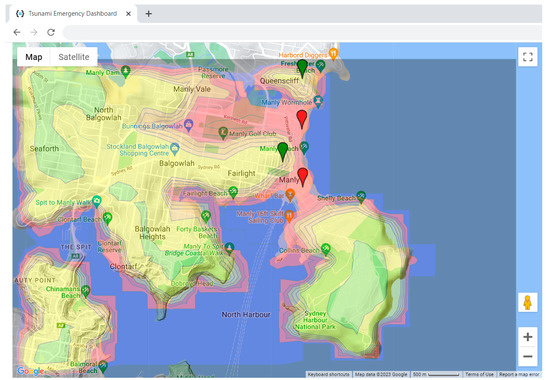 The tsunami emergency dashboard includes the map and parameters setting controls (see Figure 2 and Figure 3). The map part contains the overlayed Google map control and shows the target area with defined locations (larger green and red location icons). The locations represent places with a high concentration of people, such as supermarkets, stadiums, theatres, stations, etc., requiring special attention when planning the tsunami response actions. Each location is attributed with an approximate number of people given by a min–max range and capacity in case the location is used as an evacuation point. The colour of the icon is based on the elevation above sea level and the estimated wave height. The red colour denotes locations that should be evacuated. The green colour is used for the evacuation points that are elevated enough with respect to the estimated tsunami wave height. The application allows for adjusting the estimated wave height, which renders locations to turn dynamically into a given colour. The approximate number of endangered people is also calculated accordingly, together with the capacity of the evacuation points. The coloured contour overlay of the map is produced based on the elevation above sea level. The contours are colour-coded from red to green. The red areas are the most vulnerable to tsunami impact. The green are safe from a tsunami of the estimated height. Figure 2 shows the Manly suburb in Sydney, Australia. The tsunami emergency application allows for easy implementation to other regions as well.