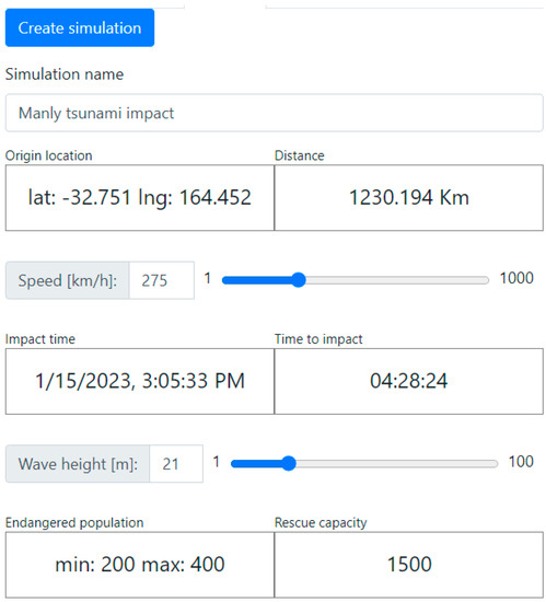 The parameter setting controls (Figure 3) are used to specify locations and tsunami parameters. The particular locations are added and edited using the map control. The locations can be identified and entered into the application prior to the simulations based on local knowledge of public places with a high concentration of citizens. The location coordinates and elevation data are obtained using the Google Map services. The tsunami origin can be retrieved from the NOAA warning service or set using the map control or even manually specifying the latitude and longitude coordinates. The application assumes that the height and speed of the tsunami is known. The tsunami wave details are estimated by deploying third-party computation engines and supplied through the CFD cloud component. The calculated wave parameters serve only as a rough estimate and can be further adjusted manually using the sliders. The estimated parameters are used to calculate the time to impact and determine the locations in danger. Correspondingly, the number of people in danger is inferred together with the capacity in locations that remain above the estimated wave height. The dashboard allows the response personnel to notify people that are in danger. The notification is received through the tsunami emergency assistant mobile application. The notification data contains the message, impact time, estimated wave height and safe location information.