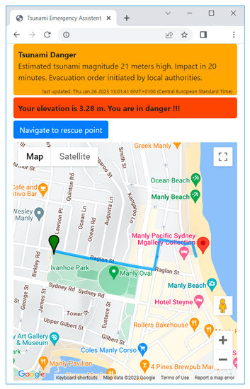 The tsunami emergency assistant is a mobile application aimed to assist people in danger of a tsunami, i.e., people in the area likely to be struck by a tsunami wave. The application is used mainly to notify and inform people about imminent danger, inform them about their situation, especially their position and elevation, and possibly navigate them to a safe place. The notification received is based on data sent through the dashboard’s notification-sending function. The application follows the four levels of tsunami alerts: warning, advisory, watch and information statement, which are based on NOAA tsunami message definitions [28]. In case of a tsunami warning and watch, the application verifies the user’s position and retrieves the elevation at the current position. If the position is in the evacuation area, the application provides navigation to the nearest safe place specified by local authorities in the dashboard. The assistant application updates the notification and safe places regularly. Thus, the safe place determination can be coordinated with the onsite response teams. This should prevent crowds from panicking to block certain pathways or exceed the capacity of a given safe place. The user interface of the tsunami emergency assistant is shown in Figure 4. The upper part of the screen is used for notifications. Below the notification area is the area for personalised information, especially the elevation at the current position. The current position is also shown in the map using the red icon. The map also displays the safe places (green icon) as determined by the local authorities. The route to the nearest safe place is calculated upon request, and the path is rendered on the map as the blue coloured line.