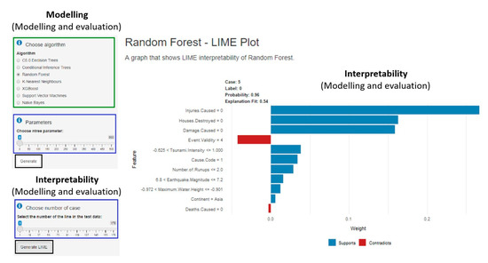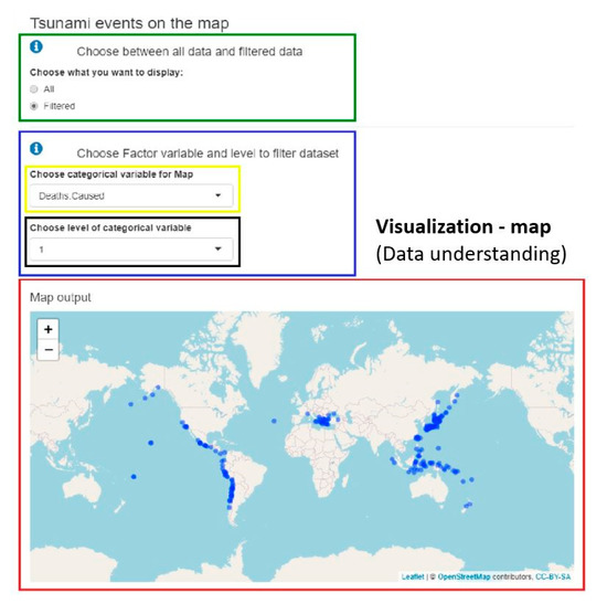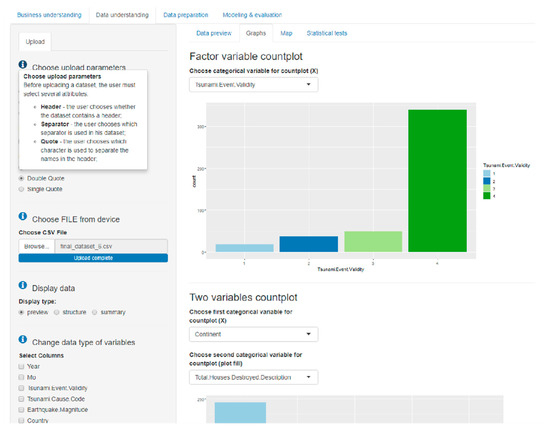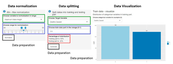 All the application functions were finally supplemented and modified within the fourth prototype. The main change was the possibility of editing the data sampling in the training set, adding algorithms with the choice of parameter values, and interpretation of the generated models using the LIME method. The final version of the “Business understanding” tab included basic information about natural disasters and tsunami principles. On the “Data understanding” tab, there was the possibility of data upload with the selection of parameters, display of data in the form of a preview, structure and summarisation, visualisation of data in four different graphs, a world map and statistical tests. The “Data preparation” tab contained several functions, especially in the side panel: data editing in the form of deleting and renaming columns, deleting the first row or all rows with a missing value, replacing missing values with the average or median value of the column, various forms of data normalisation and discretisation, the choice of the target variable and predictors, the division of the data into the training and test set in the selected ratio, the adjustment of data sampling by over-/under-sampling, the preview of the data in the training set and the visualisation of categorical data in the form of a graph. Examples of the functionalities mentioned above from the CRISP-DM methodology are demonstrated in Figure 5, Figure 6, Figure 7, Figure 8 and Figure 9.