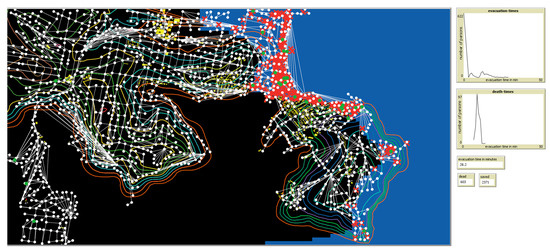 Visualisation of evacuation simulation of the Manly suburb in Sydney, Australia (see Figure 2 for the map of the area). The blue colour represents the tsunami wave propagating approximately from right to left. The white lines are the roads taken from the Open Street Map data. Yellow are the buildings also based on Open Street Map data. The white points are the intersections or places with differing elevations. The agents are moving along these lines. The coloured lines are the elevation contours. Red crosses represent inhabitants struck by the tsunami. The charts on the right show the number of inhabitants successfully finding shelter and inhabitants struck by the tsunami, respectively.