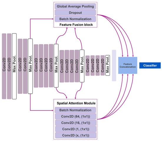 Without integrating the attention and feature-fusion blocks, the baseline VGG19 network proved superior to the rest of the pretrained networks (Table 5). Therefore, the attention and feature-fusion blocks were implemented using the baseline VGG19 architecture as the main feature-extraction pipeline.