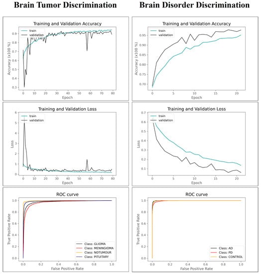 Figure 2 summarizes the performance of AFF-VGG19. Figure 2 presents the ROC curve, and the training and validation accuracy and loss for the brain tumor and brain disorder datasets.