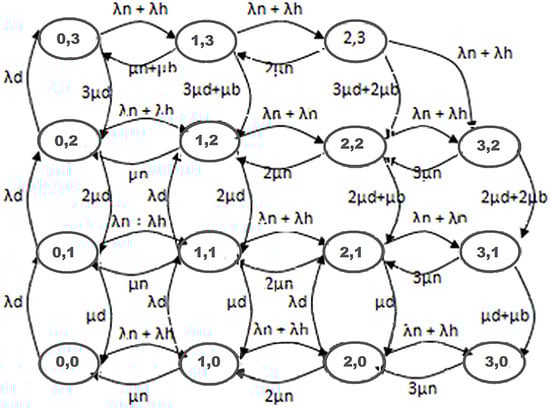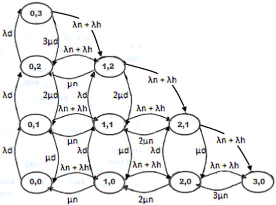 If the queue length is zero (typical examples where in specific protocol payers there is not any buffer available) then the model is simplified as shown in Figure 7. Pre-emption probability of an already existing class q service into the system equals at least the sum of products with the transition probability . The transition probability is defined as , that is the probability that the system goes over from state to state . This could happen only if the arrival time of p requests is less than the class q serving time and less than the class p serving time in state , that is,