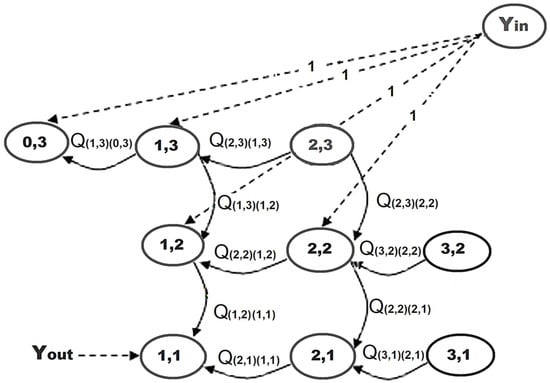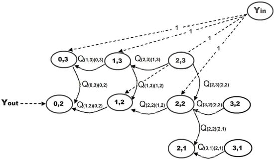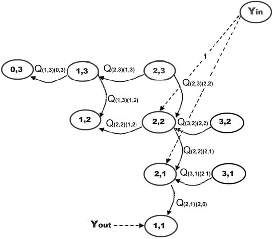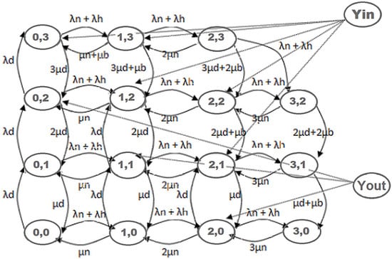 In order to analytically calculate this blocking probability, we consider the Markov queue as an input–output system with and sets of steady states. For the input set, we do consider the set of states that could accommodate one service class p request leading into pre-emption of one packet into the buffer, thus for total C = 3 resources and Q = 2 positions in the queue. Providing an example concerning the state (0,3) ∈ y_in the set will also clarify the same reasoning for the remaining states of the set. Indeed, state (0,3) means that the system serves zero class p services and three class q services; then, on receiving a new class p request, due to its priority over class q, one of the three (usually the latest arrived since the buffer is assumed to be FIFO) class q services on the buffer will be pre-empted and the system will end up into new state (1,3). On the contrary, since state (2,3) means that the system serves two class p services and three class q services; then, on receiving a new class p service, due to its priority over class q service, one of the three class q services on the buffer will not be pre-empted (the queue has only two positions) but it will be discarded and the system will end up into new state (3,2), that is (2,3) → (3,2). Due to the same reasoning, , due to capacity management (admission control), any new class p service will be immediately rejected since the maximum capacity resource C = 3 would be exceeded. On the other hand, the only allowed state transitions into set are (0,3) → (1,3) or (0,3) → (1,3) → (2,3) or (1,3) → (2,3) or (1,2) → (2,2) or (2,2) → (3,2) or (1,2) → (2,2) → (3,2) or (2,1) → (3,1).