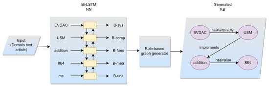 Our future work involves expanding our dataset by adding more sentences from expert articles and generating more training and validation data. This will most certainly improve the performance of the model. A better recognition of the class samples would translate into more complex and comprehensive graph generation in the end. We are also currently working on reworking our graph generation method. The simple rule-based algorithm will be replaced by a transformer neural network. This will help in generating more intelligent and elaborate graphs that will assist knowledge engineers in creating knowledge bases from expert documents. We also want to add more tags from our ontology module suite (e.g., “innovation”, “disruption”, and “mechanical object”) and together we expect the results to become substantially more complex and promising. Furthermore, we would like to extend the variety of expert articles to complete automotive roadmaps and datasheets of electric components, including targeting future components. Additionally, we are considering a tight integration loop between an OWL reasoner and the NER results together with human feedback. On the ML side, we further want to migrate to high-computing processing clusters and integrate more recent methods [34,35,36,37,38] into a combined pipeline to match our computational requirements and resources.
