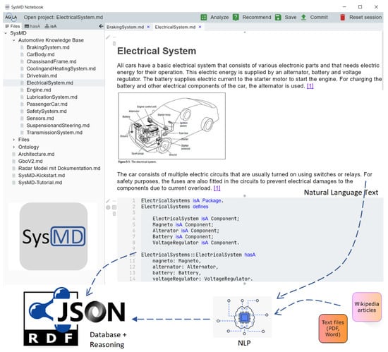 Figure 2 shows the overall application integrated with the knowledge acquisition approach outlined in this paper. We built knowledge bases with domain experts that gather general information in text documents (picture above) and with an executable and machine-processable part (below, i.e., ElectricalSystem isA Component). Natural language text can be written within the document with pictures, videos, etc., directly in combination with the formal model. Here we read wikipedia and pdf articles as shown with its symbols. This is performed with the SysMD notebook, which is based on Markdown. On the top toolbar, with “Analyze” it is possible to calculate and propagate parameters and constraints, with ”Recommend” we interface with a recommender system that proposes alternatives and related items. Our models contain basic car parts and electric components and interface with a distributed knowledge graph in the backend. Thus, mixing hand or human-defined and computer-defined knowledge together in a database that is refined by the knowledge engineer. One of the basic ideas is to let non-knowledge engineers contribute to the knowledge base, which is then qualitatively maintained in a feedback loop, which saves time. There is a bidirectional translation from the SysMD model (based on the SysML v2 metamodel) and the knowledge graph. Outlined here is the electrical system of passenger cars and some other models (e.g., braking system, drivetrain, safety system, etc.) outlined as packages on the left. A refinement step by the knowledge engineer is then to conduct the reclassification of the electrical system as system and the components as hardware components, or to let this be performed by the reasoner itself.