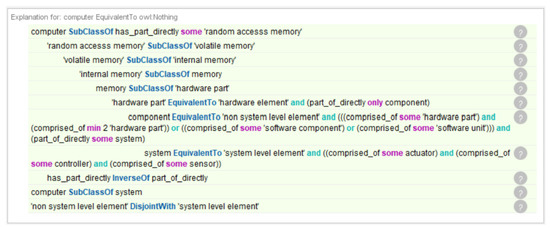 Integrating the reasoner is a work in progress, with several challenges including performance on data load, and others [39]. With a simple generated relationship example, of our hardware domain ontology (no instances, and few other TBox restrictions, except those of GBO), the HermiT 1.4.3.456 reasoner took 1 min and 40 s to analyze the relationship on a Lenovo Thinkpad X1 Extreme Gen3 with core i9 and 64 GB RAM. Figure 3 shows the reasoning chain with the involved axioms, including disjoint axioms and the hierarchical “only” restrictions, which yields an erroneous classification under the owl:Nothing class for “computer”. In this case, the resolution is to assign the transitive “has_part” relationship, which is a superclass of the object property “has_part_directly” as the edge/restriction.