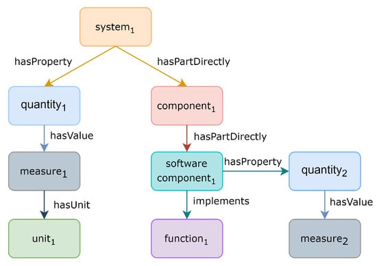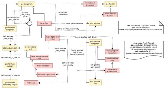 GBO is based on the Basic Formal Ontology [40] and ISO26262 standard in automotive electronic safety. Furthermore, better practices have been adopted and reasoning test cases created in order to validate parts of the ontology. It would be too space-consuming to print the full ontology for reference here, but we refer to our works [3] and the project repository ontologies referred to in the data availability statement. Instead, Figure 4 gives a visual outline of hardware and software with functions, so as to illustrate the use of GBO with a small example. Here, the digital filter system is classified with its parts, software, and functions. GBO’s classes are shown in yellow and the hardware software domain in red. The main parts for reasoning are the universal “only” restrictions and the domain and range axioms to structure the digital filter system. The figure was created using chowlk notation https://chowlk.linkeddata.es/notation.html, (accessed on 27 November 2022). Table 2 shows the classes used for tagging with its informal as well as formal definitions.