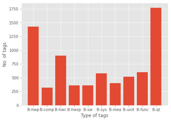 We hired two assistants who were trained with the vocabulary by the ontologist for approximately 20 h as an introduction as well as on the first hundred tags. The assistants were master students in computer science. One assistant was a male in his late twenties while the other was a female in her mid-twenties. Even though it was their second language, both could use the English language fluently and accurately in a professional setting. Furthermore, they continued to be supervised during the process for correction and questions. Tagging for 20 h a week for 3 months yielded [‘B-hwp’: 1426, ‘B-comp’: 319, ‘B-hwc’: 902, ‘B-hwsp’: 362, ‘B-sw’: 364, ‘B-sys’: 583, ‘B-mea’: 400, ‘B-unit’: 520, ‘B-func’: 597, ‘B-qt’: 1770] tags.
