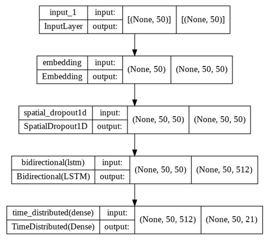 Figure 6 represents the architecture of the bi-LSTM model we used to train and test our dataset. For the input layer, we defined the shape of input equal to the maximum length of a sentence. Hence, our LSTM network is considered to take input sentences of a size no larger than fifty. Layer 2 or the embedding layer is initialized with random weights to learn the embeddings of all the words in the training data. The embedding layer of Keras Keras, by Chollet, Francois et al., at https://github.com/fchollet/keras, (accessed on 6 September 2022) is used for text data in any NLP task. We already converted out words and tags into index numbers so that the embedding layer can take integer encoded data as input and then represent each word by a unique integer. Layer 3 or spatial dropout1D layer takes input from the previous layer (None, 50) and produces output (None, 50, 50). This layer is used to drop the entire 1D feature maps instead of individual features. The bi-directional layer takes the output from the previous embedding layer (None, 50, 50). Layer 4 or Bi-directional LSTM layer has two hidden layers that process the input words in both directions and produce backward and forward outputs. Both outputs are connected to the next layer. Outputs are concatenated by default, which doubles the output for the next layer. The number of LSTM cells is passed as an argument in this layer which defines how dense the LSTM layer would be. We specify this model with 256 units which, in turn, doubles the number of outputs for the next layer. In our case, it becomes 512 () for the next layer. Layer 5 or time-distributed layer (Dense) is the output layer. It receives the input dimension (None, 50, 512) from the previous layer and provides the final output, which is the maximum length and maximum number of tags. Our label count is 21 and therefore the output of this layer is (None, 50, 21). We trained the LSTM model with index numbers since it cannot recognize text. Every word and tag was assigned a unique index number to simplify the process. Hence, the following two new rows (Word_to_index and Tag_to_index) were generated in the dataset: Word_to_index: Assign an index number to each word. These numbers were used during training to identify the words. Tag_to_index: Assign an index number to each tag. These numbers were used during training to identify the tags. We trained for 50 epochs as that gave us the best training loss curve where over- and under-fitting were best avoided. The training loss curve remained below the validation loss curve. We used “categorical crossentropy”, which we found most appropriate for a multi-class classification task. Other hyper-parameters such as the LSTM units or dropouts were adjusted with multiple passes of experimentations and comparisons. As a result, we reached the validation accuracy of 94%. Figure 6 gives an overview of this.