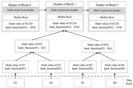 Merkle tree is a data structure based on a hash algorithm. It is a binary tree, which is composed of multiple groups of nodes [30]. Each node is the hash of its two child nodes. In the Merkle tree, the data will be divided into several small data blocks and placed at the bottom. The hash value is conducted upward and combined in pairs to form the root node. The root node is formed by the hash of its two child nodes, which represents the “top” of the tree. The formation process of the hash value of the root node of the tree is that the lowest data block first executes the hash algorithm to obtain a hash value, then the hash values of the two adjacent child nodes are merged into one value, and the hash operation is continued. The hash value of a node is obtained, and then this value is merged with the hash value of the adjacent node to generate a new value, and then iteratively repeats the above steps, and finally, all nodes are merged to form a root hash [31]. Therefore, the Merkle tree is often used to judge and check whether the data in the blockchain has been tampered with. The Merkle tree in blockchain connection is shown in Figure 1.
