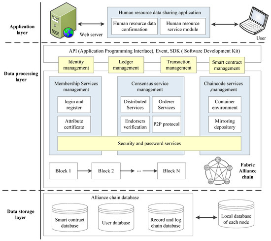 It can be seen from Figure 2 that the architecture is divided into three layers, that is the data storage layer, the data processing layer, and the application layer. The data storage layer is responsible for the data storage of the alliance chain and the local database, which includes the smart contract database, user database, record, the log chain database, and local database of each node. The data processing layer is responsible for the technical processing of data services, which is based on the Fabric alliance chain. The application layer provides users with various business functions related to human resource data sharing through API (Application Programming Interface) and events. The data processing layer can be seen as having two parts. One part includes member management, consensus service, chaincode service, security, and password service to jointly support the upper business. The other part is mainly connected with identity management, ledger management, transaction management, and smart contract management through the API interface.