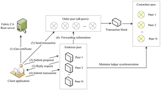 The Fabric consensus mechanism mainly includes CA Root Server, order peer, endorser peer, and committer peer. First, the client obtains authorization from the CA Root server. Second, the client application submits a proposal to the endorser peer. After the client creates a transaction proposal, it encapsulates the transaction proposal and signature as an endorsement application according to the corresponding endorsement policy. Then it sends them to all endorser peers. Among, proposal mainly includes channel information, chaincode information, timestamp, client signature, etc. Third, endorser peer reply request. Fourth, the client submits a transaction to the endorser peer. Fifth, the client sends a transaction to an order peer. Sixth, the endorser peer forwards information to the order peer. Finally, the order peer is packed into blocks and sent to the committer peer.