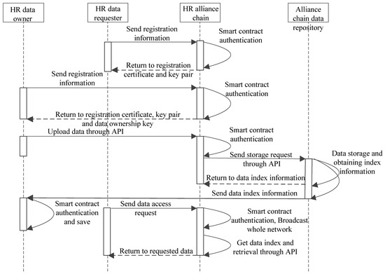 In the construction of human resource information sharing, we made full use of the advantages of the alliance chain to ensure security, privacy, and storage efficiency in the data-sharing process. There are four main types of roles involved in data sharing, which include HR (Human resources) data owner, HR data requester, HR alliance chain, and Alliance chain data repository. It can be seen from Figure 4 that the HR data owner and HR data requester need to complete registration on the alliance chain. The sequence diagram of the data-sharing process is shown in Figure 4.