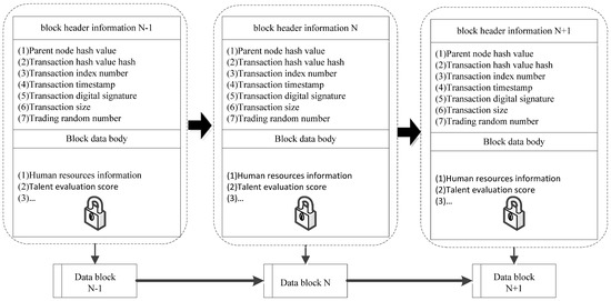 In our system, the human resources information blockchain is composed of a series of blocks with a version number. After the human resources information with block information is generated, the system will connect this information according to the generated time sequence to form the human resources information blockchain. On the blockchain, the blockheads and block data subjects of all blocks are on the chain. The sample of human resources of the storage blockchain is shown in Figure 5.