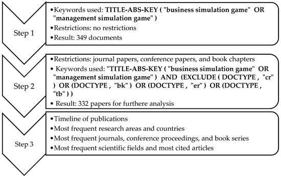 Bearing in mind all facts mentioned above in the theoretical part of the paper, a need for synthesised literature on the chosen topic and more detailed knowledge of the fields where business simulation games are applied and investigated arises. Accordingly, a bibliometric analysis is conducted, followed by text and topic analysis of papers published on business simulation games.