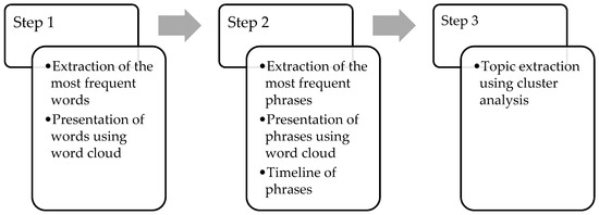 First, the most frequent words were extracted from the papers. Second, the most frequent phrases were extracted from the papers. To provide a timeline of the research, phrases were analysed concerning the year of the paper’s publication. Third, topic mining was conducted using cluster analysis, which was performed using the average-linkage hierarchical clustering algorithm [50]. The distance between two clusters represents the medium distance between each observation in one cluster and every other observation. The dendrogram defines only the temporal order of the branching sequence; the sequence of phrases cannot be interpreted as a linear representation of those distances [51]. Therefore, any cluster on the dendrogram can be rotated across its branches without affecting its signification. The extracted information is visually presented in word clouds, bubble plots, and dendrograms [52].