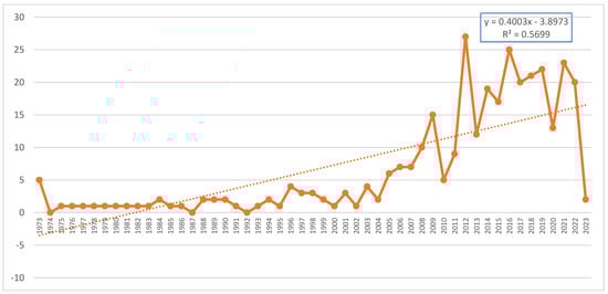 Figure 7 shows the times cited and publications over time. Both 2012 and 2016 have the most publications, earlier years have fewer, and, in recent years, the number of publications on the topic is increasing, except in 2020, which can be explained by the trend that most of the publications were oriented toward the COVID-19 pandemic crises during that time [53]. As for the citations, the Figure 8 shows that the number of citations varies in line with the number of publications. Both the number of papers and the number of citations is increasing, indicating that the topic’s importance has been increasing over the years and is correlated (Figure 7 and Figure 8).