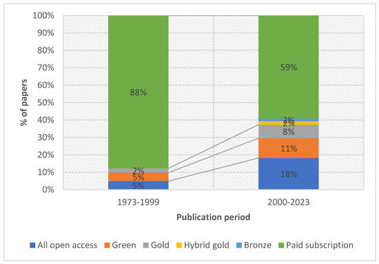 Paper’s access type in the period 1973–1999 vs. 2000–2023; Source: Authors’ work based on Scopus.