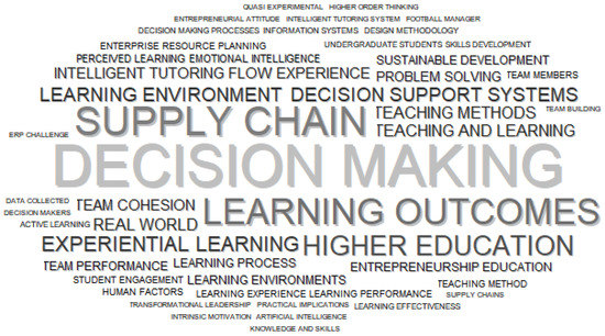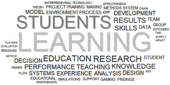 Table 6 presents the phrase extraction of the phrases with the highest occurrence in the selected papers to develop further in-depth knowledge of the business simulation games and the application fields. The phrase with the highest frequency and TF-IDF index indicating relevance is “decision making”, which occurs 96 times in the 48 research papers emphasising the relevance of the simulation games for decision-making training. “Supply chain” is the second phrase with the highest frequency in the selected papers, which occurs 66 times in 22 papers. The third phrase with the highest frequency is “learning outcomes”, which occurs 60 times in 29 papers. The top ten most frequently used phrases are mostly domain driven, such as “higher education”, “experiential learning”, “learning environment”, “real world”, and “teaching and learning”. However, several phrases are domain driven, such as “decision support systems”, “entrepreneurship education”, “sustainable development”, “enterprise resource planning”, and “football manager”. Primary research motivation was also investigated. It can be concluded that most of the frequent phrases are dominantly learning driven; several were domain driven, while, again, none of the papers were technology driven.