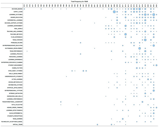 Figure 11 presents the bubble plot of the frequency of the most frequent keywords per publication year.