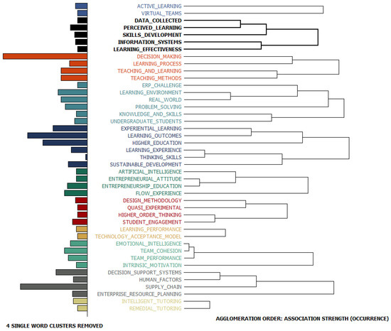 The final step of the analysis is topic mining which was conducted to extract clusters of phrases providing a more precise description of the research topics of the papers in the field of business simulation games. The cluster analysis was conducted using the Wordstat program, and seven different clusters were extracted, as presented in Figure 12. Figure 13 presents the mapping of clusters and cluster phrases, indicating the relevance and cohesion of the cluster items.