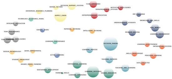 The highest TF-IDF value has the word “learning”, which occurs 720 times. Among the top ten most frequently mentioned words in the observed papers are words such as “students”, “research”, and “education”, which are related to the topic itself, and they appear in more than 50% of observed papers. Furthermore, among the top ten most frequently mentioned words are words such as ”decision”, “knowledge”, and “teaching”, which pinpoint the interconnection of the observed topic with education and research.