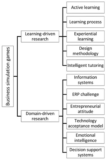 Domain-driven research on business simulation games focuses on a specific field of business. Numerous authors investigate the role of simulation games and their importance in learning various domains, such as economics, finance, and the business management of different organisations, e.g., [31,42,43]. For example, the authors of [44] accentuate the importance of simulation games in learning business finance. However, in addition to the education field, the authors of [31] emphasise how papers dealing with business simulation games are also linked to research topics such as decision-making, teamwork and similar experience gaining, and strategy development. Similarly, the authors of [42] accentuate how quality business strategy establishment and successful business process management depend on simulation games. According to the organisational level, simulation games are mostly domain driven and can be divided into three categories: (1) top management business simulation games focused on gaining management experience; (2) functional business simulation games oriented to take on a role in one of the organisation’s departments; and (3) concept business simulation games relating to taking on a role in the management of a particular business concept such as sales [31].