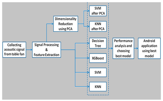 So, in order to obtain reliable results, we plan to create a predictive model of machine health predictions using machine learning approaches based on the machine’s real data. It analyzes the data, anticipates deviations, and alerts the user to any abnormalities in the machine’s operation. The proposed method uses classification (binary classification) and predicts whether the given observation of a machine is normal or abnormal. Our suggested prediction method is depicted in Figure 1, and it entails using popular machine algorithms such as: KNN, SVM, decision tree, and XGBoost [39,40]. The performance characteristics of various algorithms are then examined, and the best algorithm is picked for the predictive machine learning model’s [41,42,43] final development. The technique also reports the irregularity through a user interface in which the front end is built with Android Studio and the backend is built with Flask, a Python framework, and the server is hosted on Heroku. The following Figure 1 is elaborated in various stages as follows.