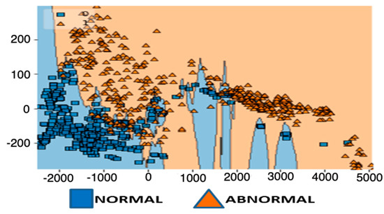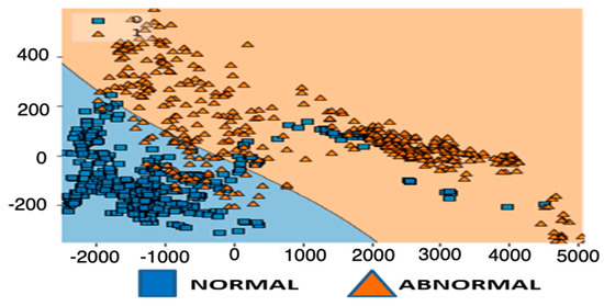 SVM (support vector machine) is a supervised machine learning method used for classification and regression issues. Internally, SVM creates a hyperplane that separates two or more classes most effectively [33]. This algorithm uses less computation power with significant accuracy. This is used to find a hyperplane that distinctly classifies the data points. SVM algorithm uses a technique called “kernel trick” that takes low dimensional input space and transforms it into a higher dimensional space. This kind of feature is useful when we want to work with extremely complex data. This is carried out iteratively to gain more precision and minimize error. This algorithm is used with two functionalities: 1. SVM with kernel trick and 2. PCA with SVM. This is done and experimented with the above as the problem domain is complex and expects good accuracy of prediction. A support vector machine (SVM) is a powerful and versatile algorithm which is capable of doing linear or non-linear classification and regression. It has another popular functionality of outlier detection as shown in Figure 4. This functionality helps in the experimentation process especially in dealing with data significant to the experimentation. To deal with higher dimensional data and to optimize the classification process of the algorithm, this algorithm adds another functionality of “kernel trick” that is intended to process the dataset using a set of pairwise similarity comparison among the data observations. This added feature greatly helps the SVM algorithm in reducing the computational power during the training and validation stage of the algorithm. As the observed data for the diagnosis of health condition of machinery in industry environment include signal processed data that contain imperfections in the form of impression and uncertainty (noise), we have used PCA (principle component analysis) integrated with SVM process. The combined process works effectively in the detection of patterns in the system. The integration of PCA with SVM classification process helps in (1) identifying the data properties which are important and contributes majorly to the detection of faults in the machine properties (observed patterns) and (2) it helps in reducing the data properties especially when the data is multi-dimensional in orientation.