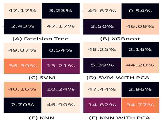 True positive and true negative values are higher in a good-performing model, whereas false-positive and false-negative values are lower [34]. The XGBoost model has the greatest true-negative rate and the lowest false-positive rate, as shown in Figure 9. When compared to the XGBoost model, decision tree has the lowest false-negative rate and the greatest true-positive, but it also has a higher false-positive rate and a lower true-negative rate. As a result, the decision tree performs worse than XGBoost. As a result of analyzing the confusion matrices of six prediction models, it is clear that XGBoost outperforms the others.