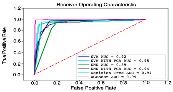 The ROC curve (receiver operating characteristic) of the employed algorithms, decision tree, XGBoost, SVM with PCA, KNN, SVM, KNN with PCA, is shown in Figure 10. The trade-off between sensitivity and specificity is depicted by the ROC curve. The model with higher performance usually has a roc curve that is closer to the plot’s upper left corner [35]. Furthermore, the area under the ROC curve is among the finest measures for evaluating the model’s performance. The model’s ability to discriminate between positive and negative classes is represented by the area under the ROC curve. The greater the AUC, the better the model’s performance. When we analyze the ROC curves of the four algorithms discussed, the ROC curve of XGBoost model, with the vertex start at the top left of the plot and an AUC (area under the curve) of 0.99, outperforms decision tree, SVM model, SVM with PCA, KNN, and KNN with PCA, which have AUCs of 0.94, 0.92, 0.95, 0.89, and 0.94, respectively.