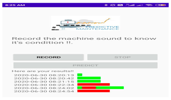 The user interface is created with Android Studio (for front-end) and with Flask (for back-end), and the application provides the user to record the functioning of a machine (through sound) and visualize its health status, such as whether it is normal or abnormal, as well as the time stamp, allowing the user to gain insight into the machine’s condition [40,44,45,46,47,48].