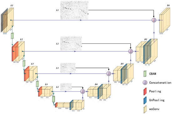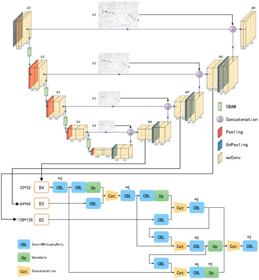This section describes the structural components of the algorithm after the improvement and explains the reasons for the modification. The focus of this paper is to improve the accuracy of the model to segment the crack data in the presence of disturbances. With the Unet model [17] as the main backbone and the CBAM (convolutional block attention module) attention module [18] added to each layer of the encoder (left path) to better perform initial feature extraction on the input data, the decoder structure concatenates Laplacian residuals [19] based on Unet to incorporate more detailed information.