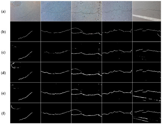 Results of pavement segmentation dataset. (a): input color images. (b): ground truth. (c): results of the UNet. (d): results of the UperNet. (e): results of the ResUNet. (f): results of the Pointrend.