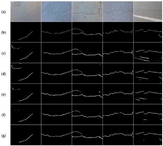 Results of the pavement segmentation dataset with different modules added. (a): input color images; (b): ground truth; (c): results of the Pointrend; (d): results of the Att-UNet; (e): results of the AttWS-UNet; (f): results of the AL-UNet; (g): results of the ALP-UNet.