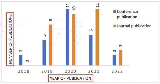 The selected 58 publications consist of 26 (46%) conference publications and 32 (54%) journal articles published from 2018 to 2022. A summary of retrieved articles is in Figure 2.