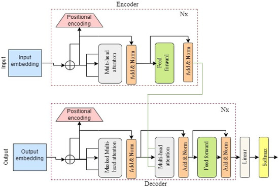 A position-wise fully connected feed-forward network and multi-head self-attention form part of the encoder/decoder layers. Additionally, there is a residual layer with a normalization function to ensure the models’ optimal performance [25].